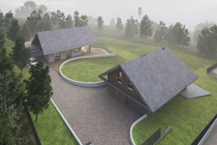 Nowoczesna interpretacja klasycznych kształtów stodoły, zdublowanych i ułożonych pod kątem na działce w spadku.